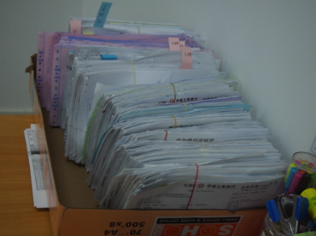 財務辦公室里大大小小的文件筐里