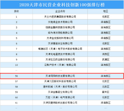 同陽科技榮登2020天津市民營企業(yè)科技創(chuàng)新百強排行榜